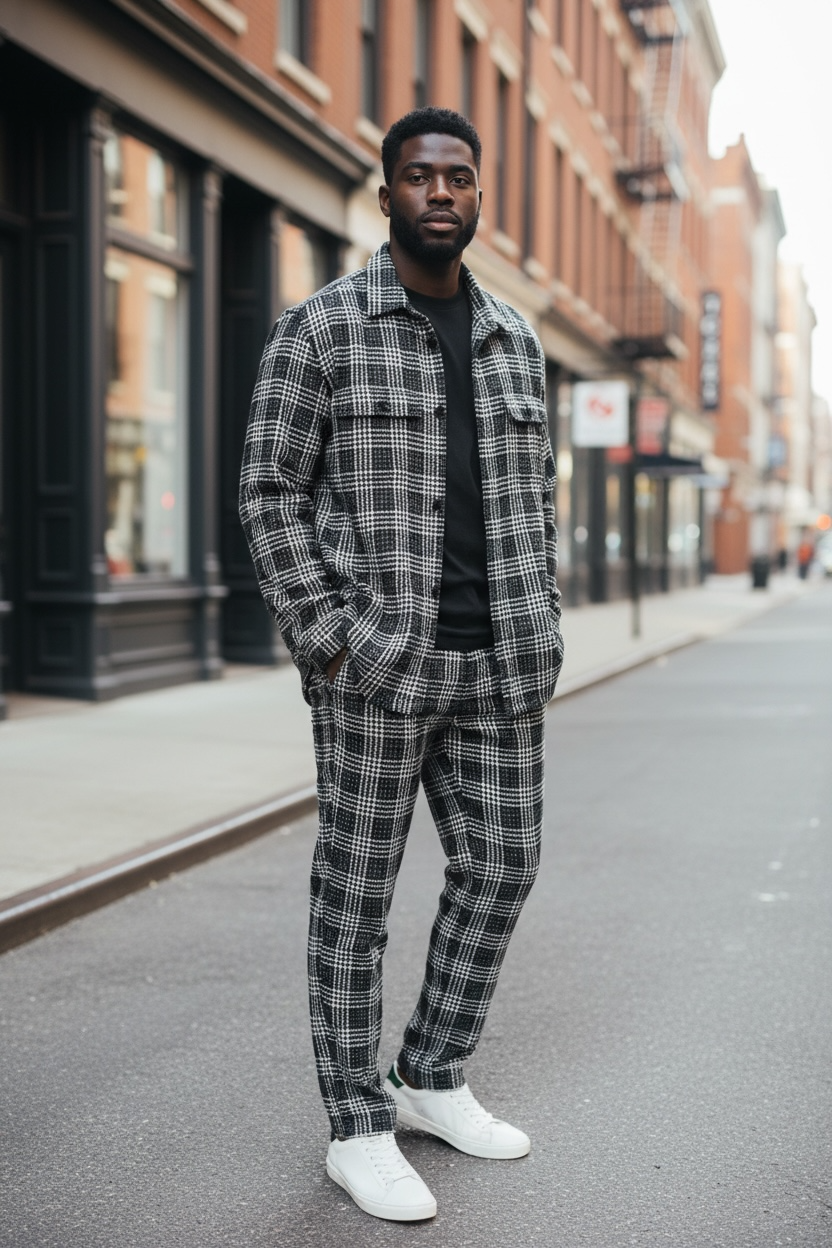 This Lanzzino Two-Piece Set (100% Poly) brings sharp urban style and everyday comfort together in one standout outfit. Featuring a clean black-and-white plaid pattern, the jacket offers a modern, structured look with chest pockets and a relaxed fit. The matching drawstring pants provide an easy, adjustable fit while maintaining a sleek, tailored silhouette. Lightweight, comfortable, and effortlessly stylish, this set is perfect for elevated casual wear, weekends, or nights out.