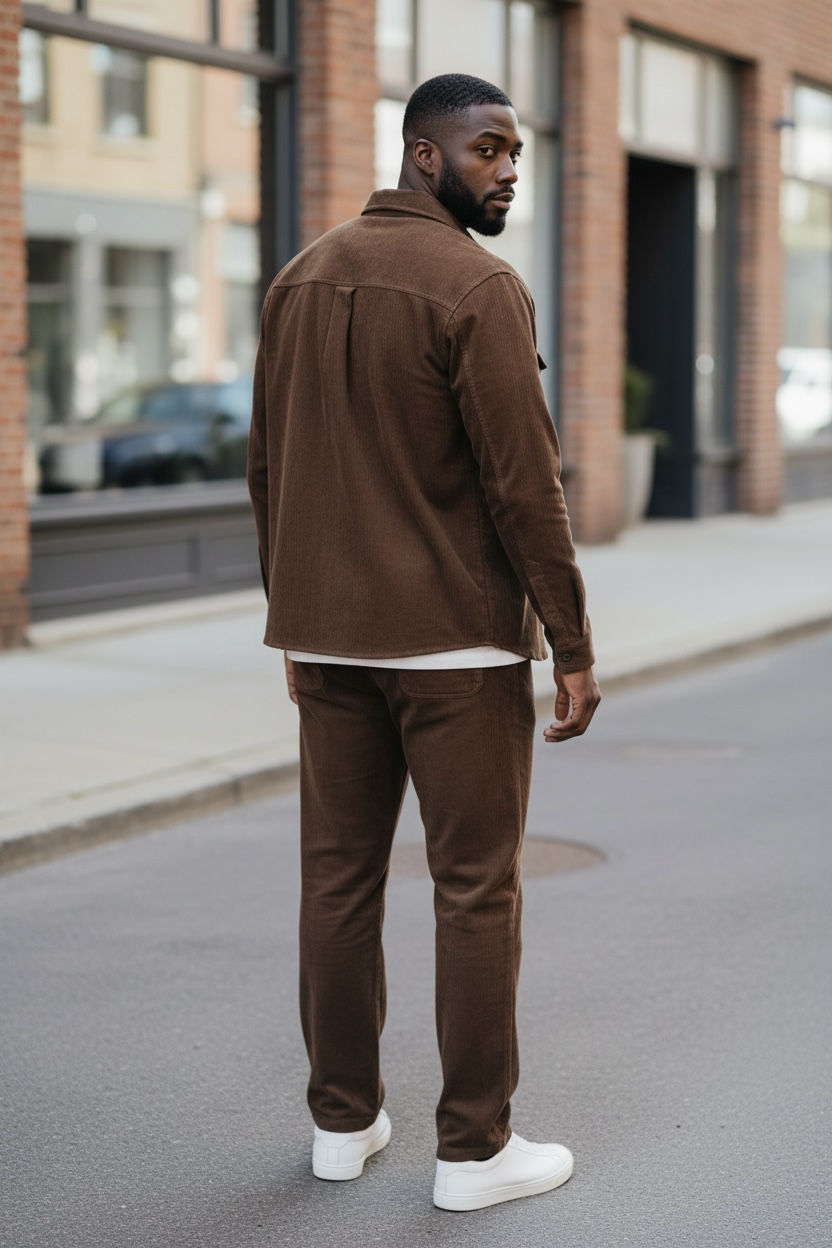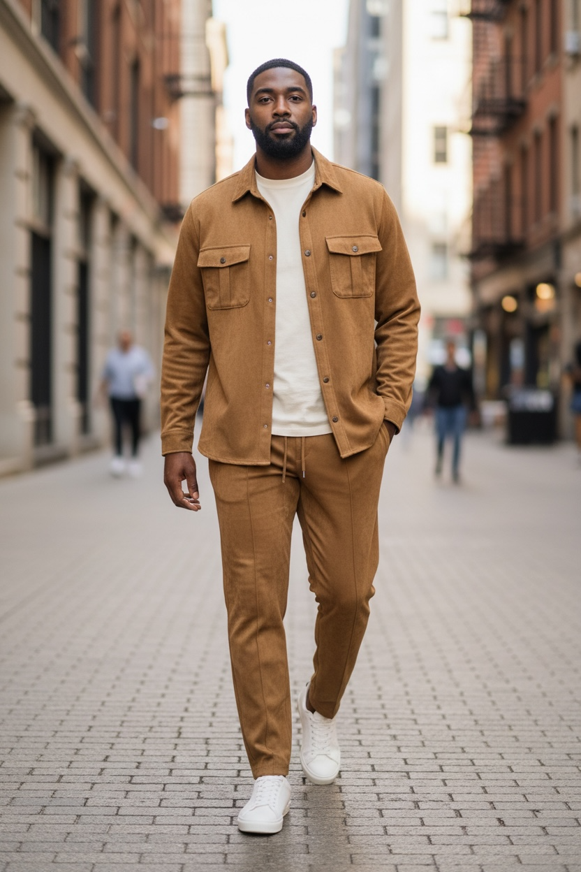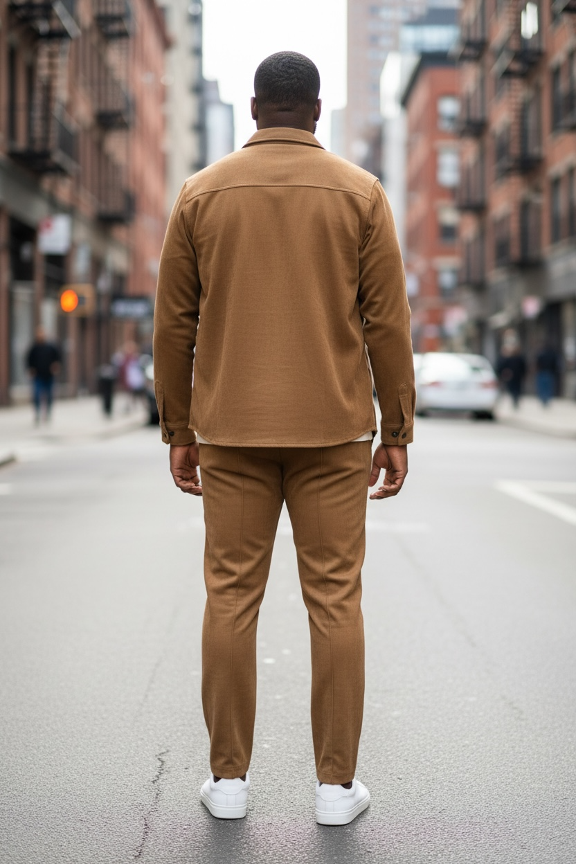 The Lanzino Style 3121 Two-Piece Set delivers a sleek, modern look with a luxurious suede-feel finish crafted from a premium cotton, poly, and spandex blend. The shirt jacket features a clean, structured silhouette with dual chest pockets, offering both style and functionality. Matching drawstring pants provide an adjustable, comfortable fit with a tailored look that moves effortlessly with you. Soft, flexible, and elevated, this set is perfect for refined casual wear, evenings out, or everyday comfort with a high-end feel.